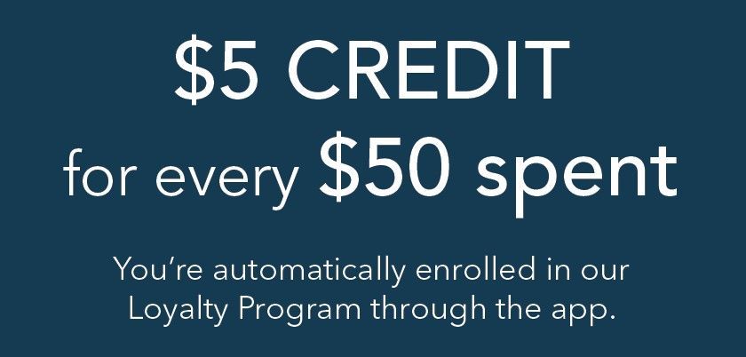 - You're automatically enrolled in our Loyalty Program and will receive $5 CREDIT for every $50 spent!