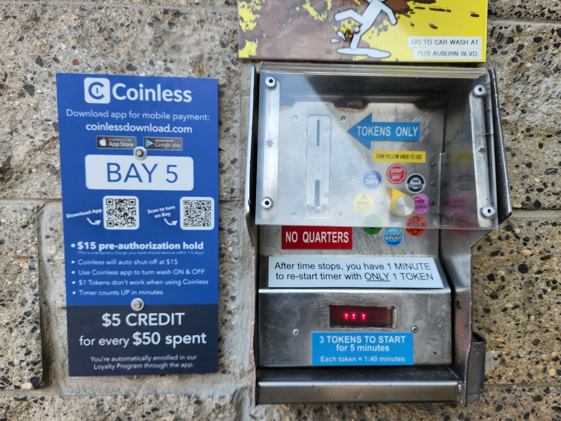 Purchase $1 tokens at the Cash Machine, using paper bills, credit & debit cards, Apple Pay & Google Pay. Use to wash, vacuum and purchasing vending.